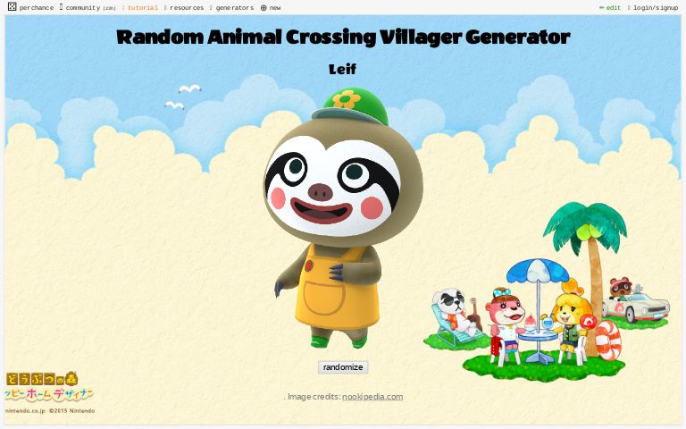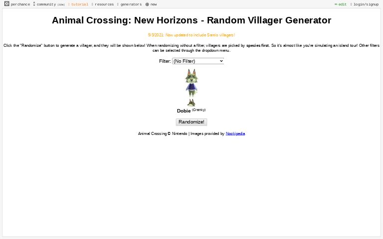 New Horizons providing an items database as well as other tools for the game. My inability to come up with an island name plus social distancing plus killing time until March 20 produced this. Click the Randomize button to generate a villager and they will be shown below.