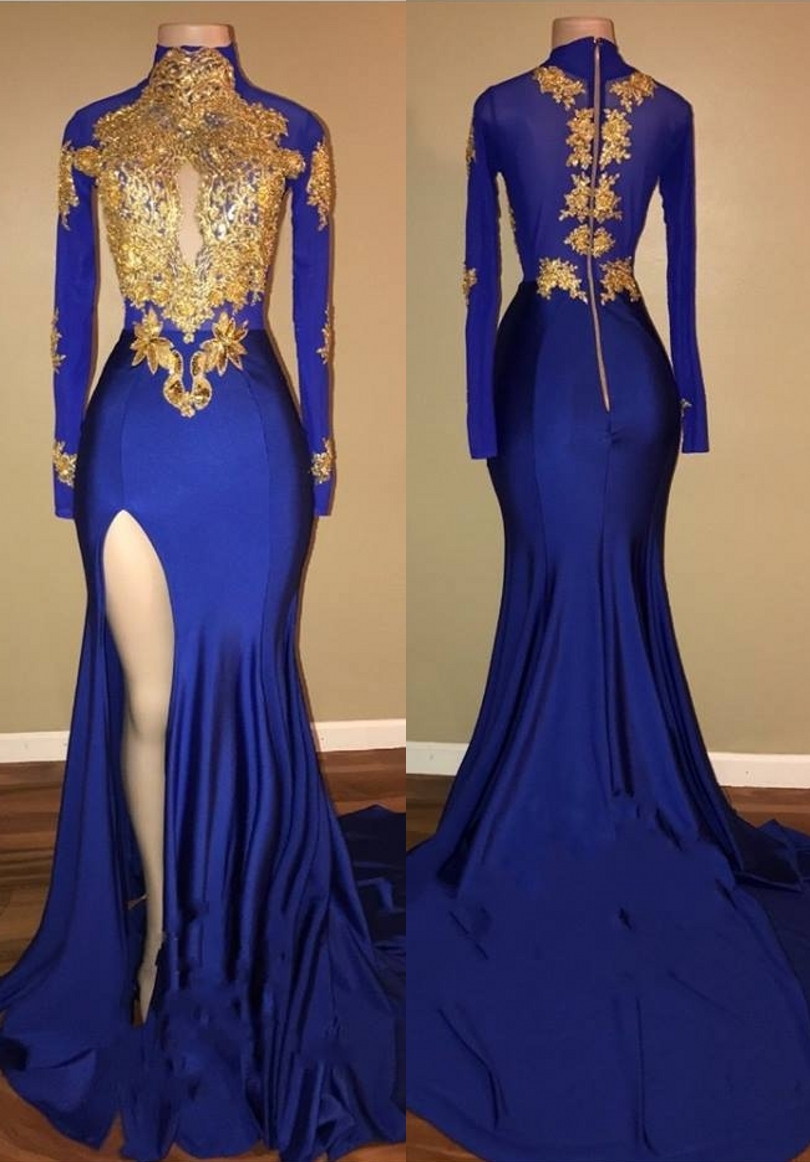 Royal Blue Gold Prom Dresses Long Sleeves Side Slit Evening Gowns On Luulla